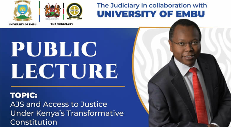 The topic for the Lecture will be “𝐀𝐥𝐭𝐞𝐫𝐧𝐚𝐭𝐢𝐯𝐞 𝐉𝐮𝐬𝐭𝐢𝐜𝐞 𝐒𝐲𝐬𝐭𝐞𝐦𝐬 (𝐀𝐉𝐒) 𝐚𝐧𝐝 𝐀𝐜𝐜𝐞𝐬𝐬 𝐭𝐨 𝐉𝐮𝐬𝐭𝐢𝐜𝐞 𝐔𝐧𝐝𝐞𝐫 𝐊𝐞𝐧𝐲𝐚’𝐬 𝐓𝐫𝐚𝐧𝐬𝐟𝐨𝐫𝐦𝐚𝐭𝐢𝐯𝐞 𝐂𝐨𝐧𝐬𝐭𝐢𝐭𝐮𝐭𝐢𝐨𝐧.” The lecture will bring together leading stakeholders in the justice sector, including members of the Judiciary, legal practitioners, administrators, community and religious leaders, scholars, and students.