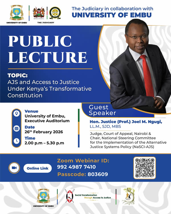 The University will be hosting a Public Lecture by Hon. Justice (Prof.) Joel M. Ngugi LL.M, SJD, MBS on 𝐓𝐡𝐮𝐫𝐬𝐝𝐚𝐲, 𝟐𝟔𝐭𝐡 𝐅𝐞𝐛𝐫𝐮𝐚𝐫𝐲, 𝟐𝟎𝟐𝟔, starting from 𝟐.𝟎𝟎 𝐩.𝐦. at the Executive Boardroom. Hon. Justice (Prof.) Joel Ngugi is an eminent Judge, Court of Appeal, Nairobi and Chair, National Steering Committee for the Implementation of the Alternative Justice Systems (AJS) Policy (NaSCI-AJS). 𝐓𝐡𝐞 𝐏𝐮𝐛𝐥𝐢𝐜 𝐋𝐞𝐜𝐭𝐮𝐫𝐞 𝐰𝐢𝐥𝐥 𝐟𝐨𝐜𝐮𝐬 𝐨𝐧 𝐀𝐥𝐭𝐞𝐫𝐧𝐚𝐭𝐢𝐯𝐞 𝐉𝐮𝐬𝐭𝐢𝐜𝐞 𝐒𝐲𝐬𝐭𝐞𝐦𝐬, 𝐚 𝐬𝐮𝐛𝐣𝐞𝐜𝐭 𝐨𝐟 𝐠𝐫𝐞𝐚𝐭 𝐬𝐢𝐠𝐧𝐢𝐟𝐢𝐜𝐚𝐧𝐜𝐞 𝐢𝐧 𝐬𝐭𝐫𝐞𝐧𝐠𝐭𝐡𝐞𝐧𝐢𝐧𝐠 𝐚𝐜𝐜𝐞𝐬𝐬 𝐭𝐨 𝐣𝐮𝐬𝐭𝐢𝐜𝐞 𝐚𝐧𝐝 𝐞𝐧𝐡𝐚𝐧𝐜𝐢𝐧𝐠 𝐜𝐨𝐦𝐦𝐮𝐧𝐢𝐭𝐲-𝐛𝐚𝐬𝐞𝐝 𝐜𝐨𝐧𝐟𝐥𝐢𝐜𝐭 𝐫𝐞𝐬𝐨𝐥𝐮𝐭𝐢𝐨𝐧 𝐦𝐞𝐜𝐡𝐚𝐧𝐢𝐬𝐦𝐬.